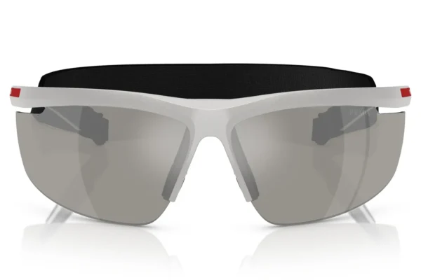 Occhiali sportivi di lusso, Made in Italy, in acetato tecnico e metallo leggero. Design minimalista e performante, con logo rosso distintivo, ideali per chi cerca eleganza e funzionalità.
