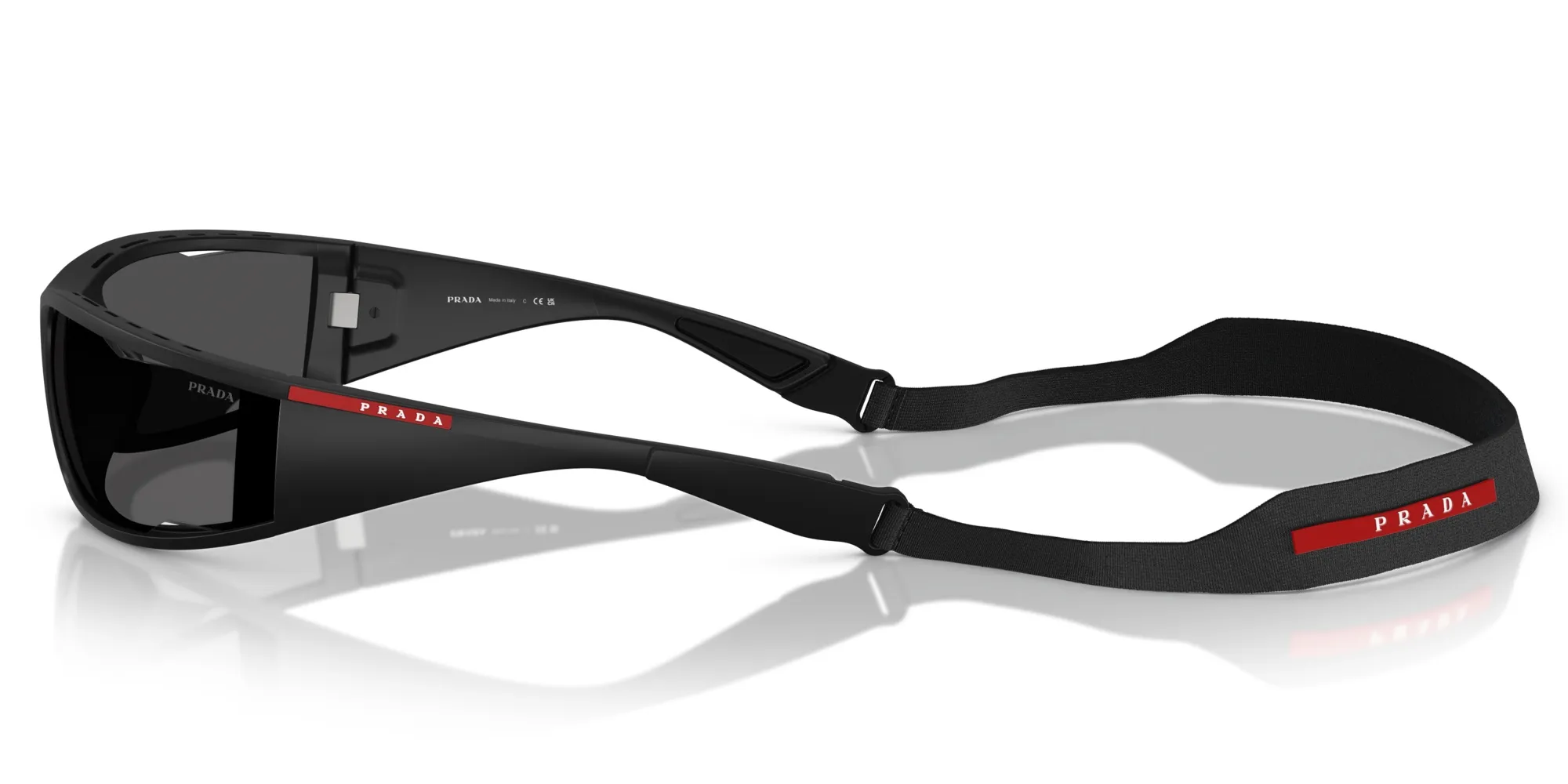 Occhiali sportivi di lusso, Made in Italy, in acetato tecnico e metallo leggero. Design minimalista e performante, con logo rosso distintivo, ideali per chi cerca eleganza e funzionalitร .